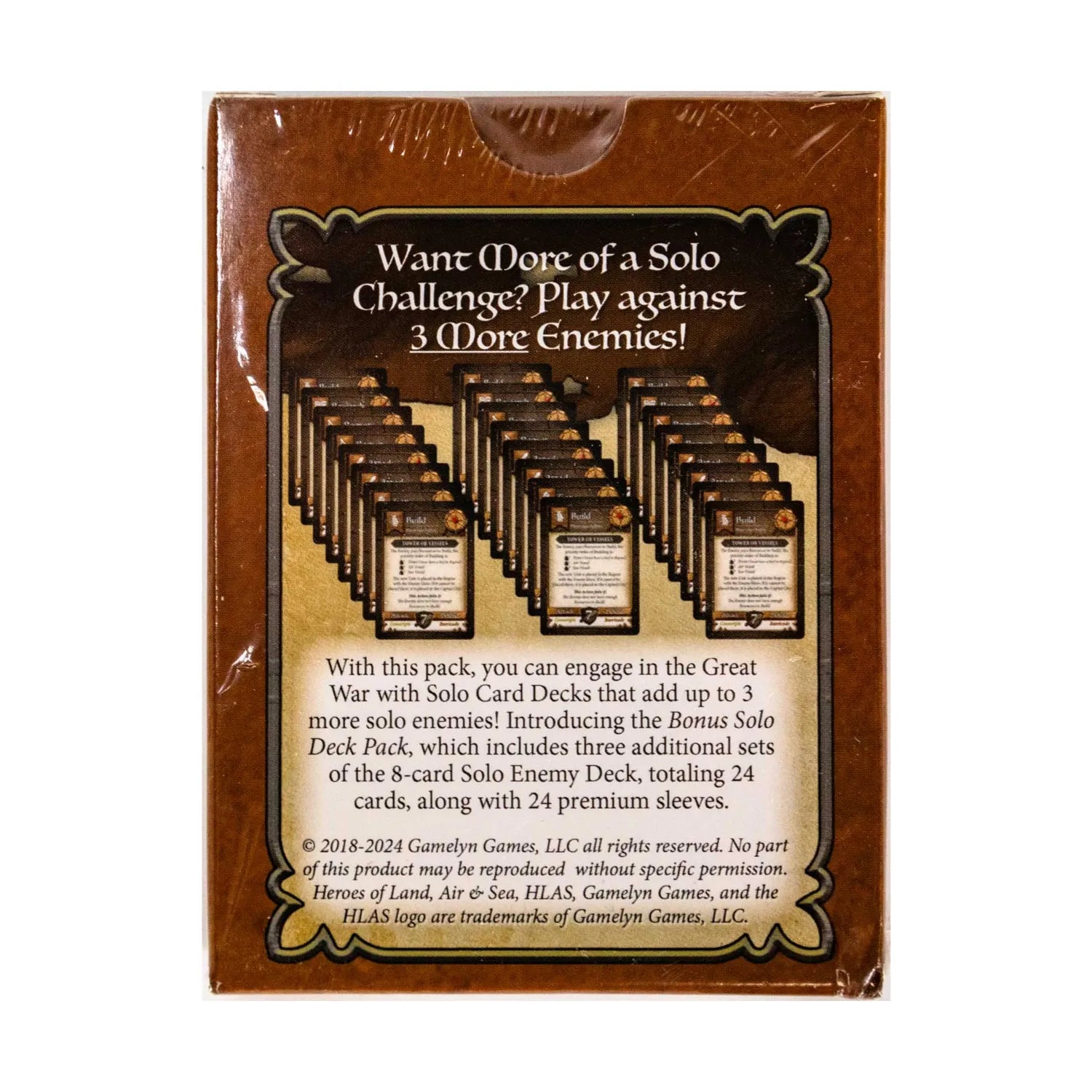 Introducing the Solo Deck Pack, which includes three additional sets of the 8-card Solo Enemy Deck, totaling 24 cards, along with 24 premium sleeves. With this pack, you can engage in thrilling battles against three more solo enemies. And if you pick up two packs, you’ll have enough sets to wage war on six solo enemies! Best of luck in your conquests!